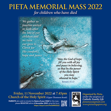 We gather each year united in faith after the loss of our children, and turn our gaze to Christ for His comfort, hope and peace. This year's Memorial Mass will be held on Friday 7th Nov 2025 at the Cathedral of the Good Shepherd in Queen Street (arrive by 7.45pm). We are blessed to have Fr Gerard Louis, CSsR, as our celebrant and the St Francis Xavier Choir of the Church of St Ignatius to lead us in song. In our usual tradition, we will light a tealight candle for each child and share a Remembrance montage of all the children remembered at the Mass. If you wish to include your child's name, please REGISTER here before 24th October 2025. For any clarification, please contact us at [email protected].